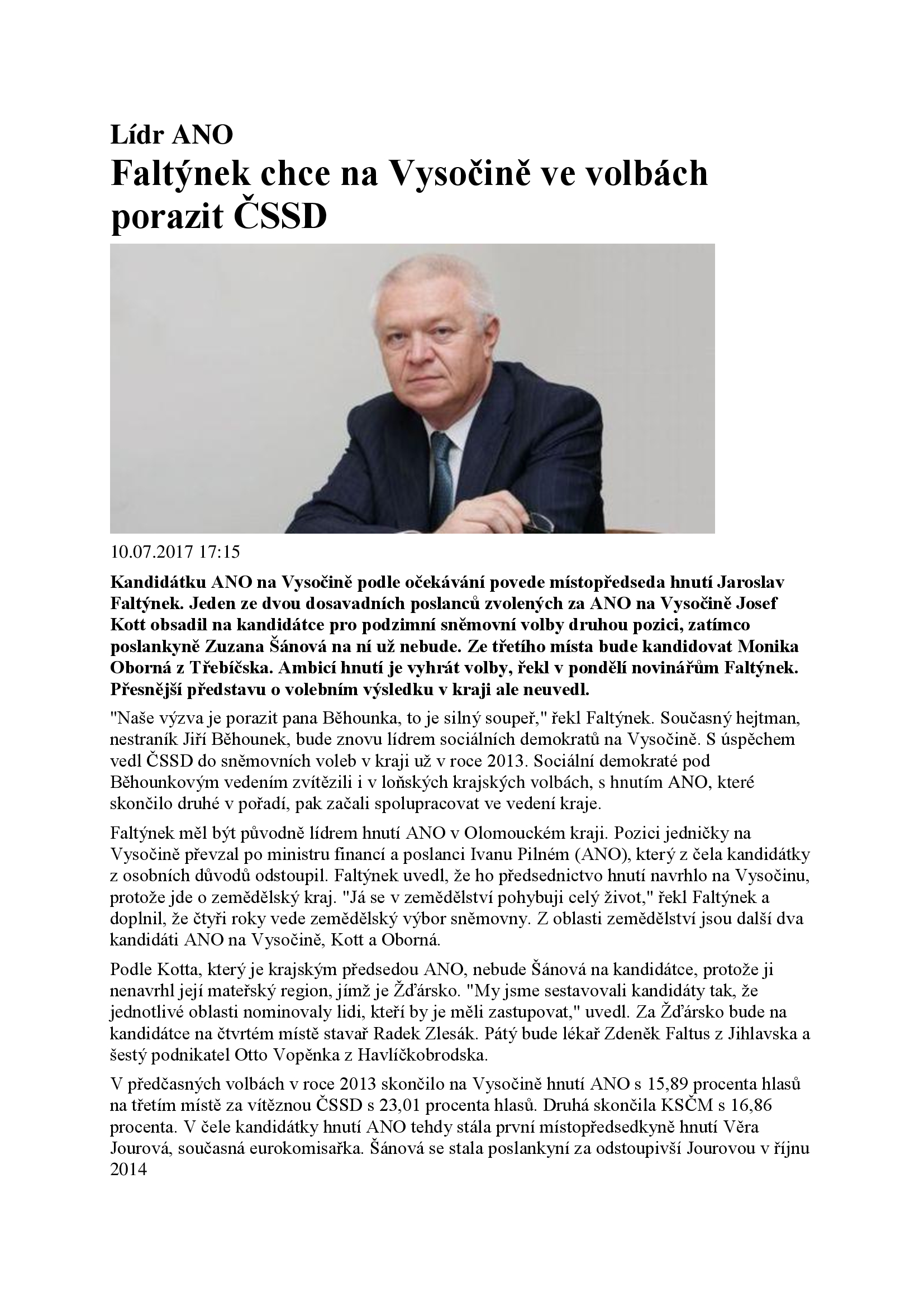 V pondělí se v Jihlavě konala tisková konference, na které byla představena kandidátka Hnutí ANO do parlamentních voleb, které se budou konat ve dnech 20.10.-21.10.2017